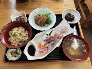 着いたらすぐ近くの定食屋さんへ誘わられるように行きました。刺身が新鮮で超美味しいです。