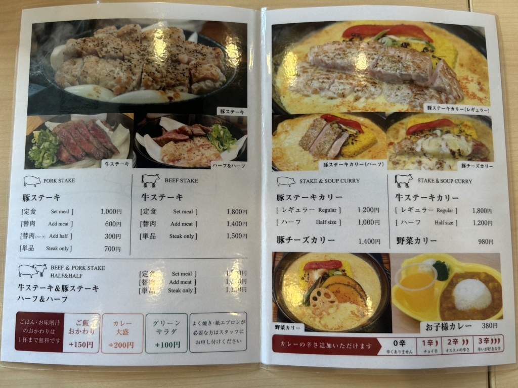 しかも博多のお店たちと違い、一つの店舗で豚ステーキのカレーも豚ステーキの定食も食べられるという、さらに博多店では無い牛ステーキ