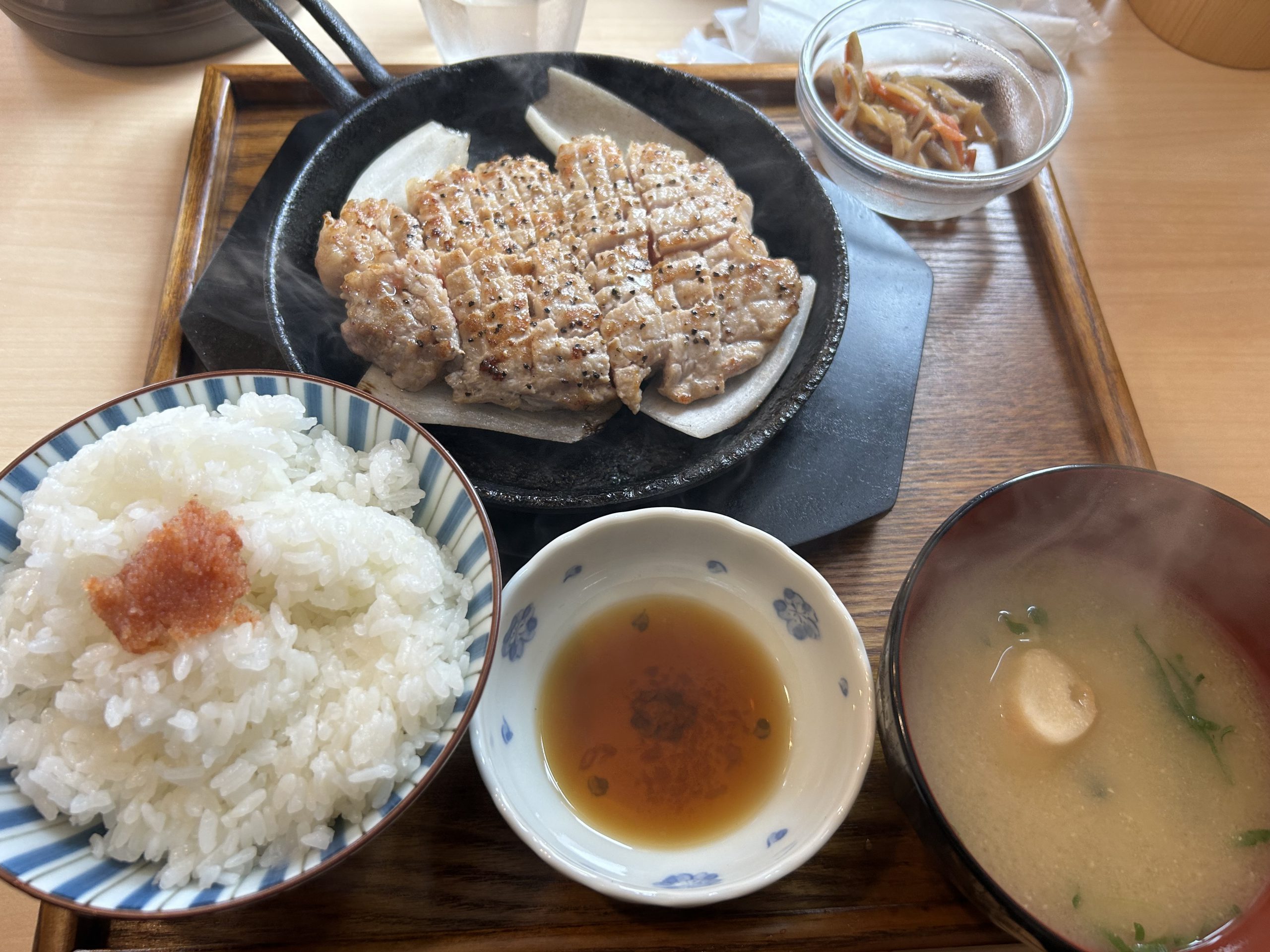 こちらが豚ステーキの方です。中間店ではご飯に無料で明太子を乗せるサービスがありました。博多店は以前、梅ご飯とか選べたのですが