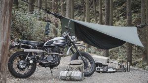 バイクにまたがりキャンプ場に向かい